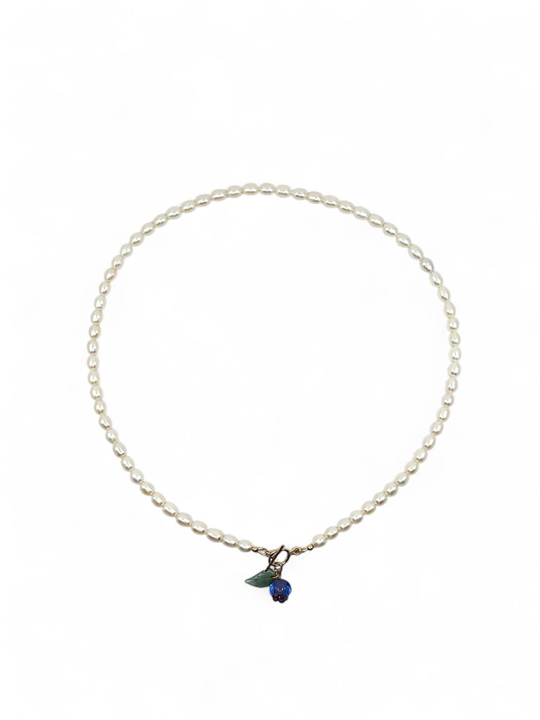 This is a one-of-a-kind necklace with the prettiest soft cream Freshwater Pearls, a glass blueberry charm topped with a delicate Jade leaf. It’s feminine, whimsical and made for a special kind of customer. The necklace can be worn 2 ways: toggle in the front or toggle at the back with a classic Pearl necklace as the focus.