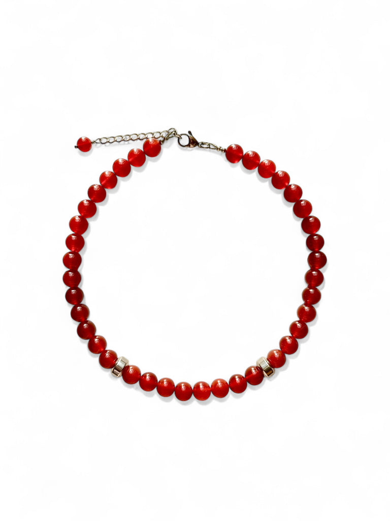 The Greta Carnelian Necklace is a modern take on a heavier traditional bead necklace. It has stainless steel beads that act as accents that contrast the strong hue of red.