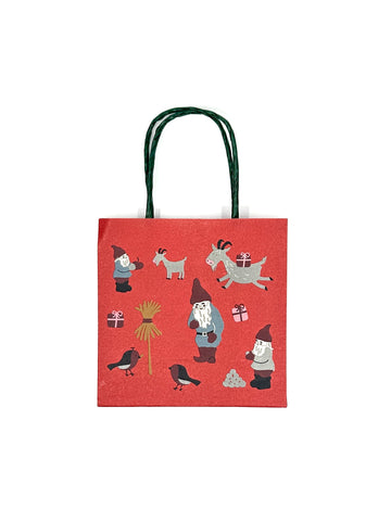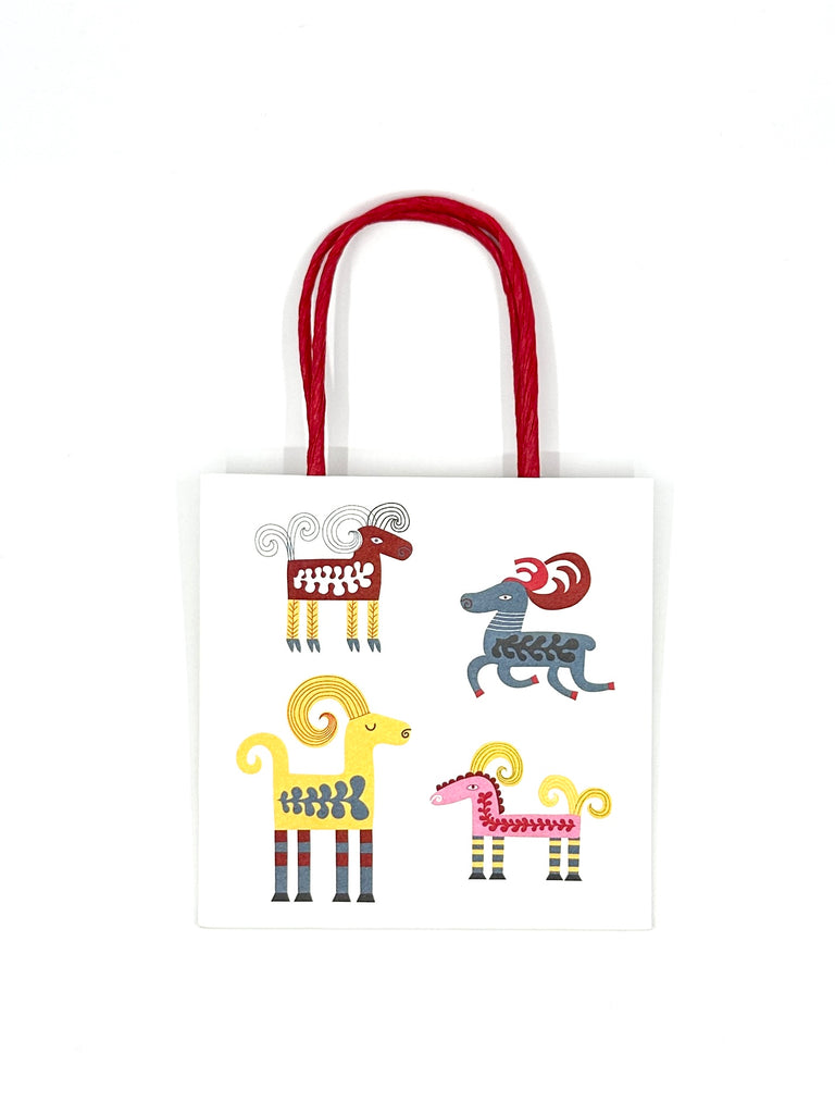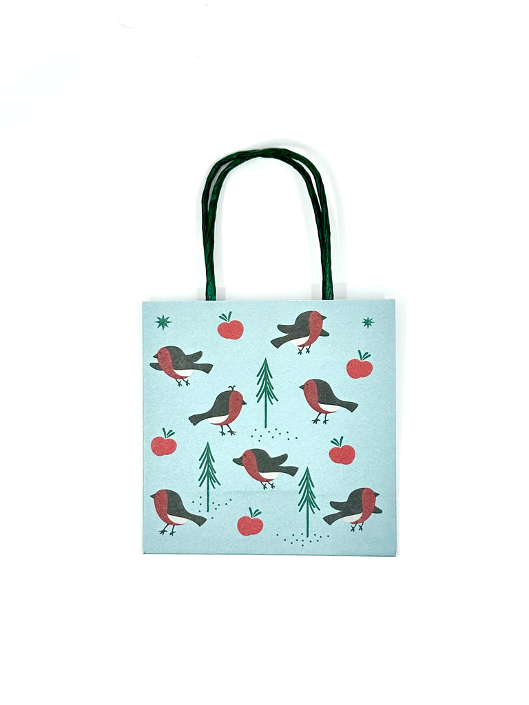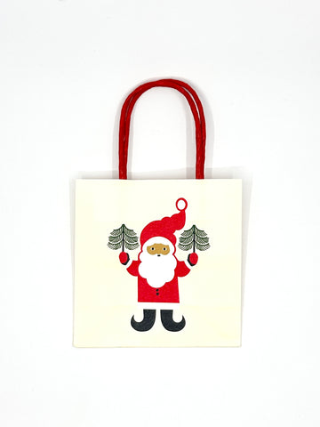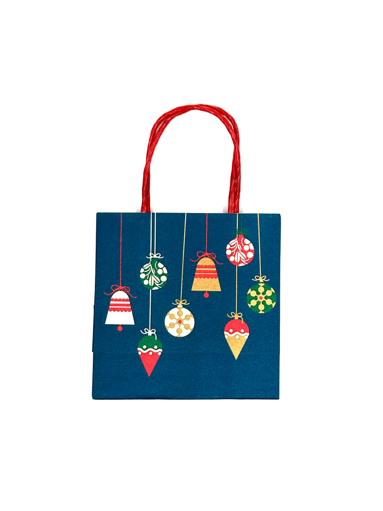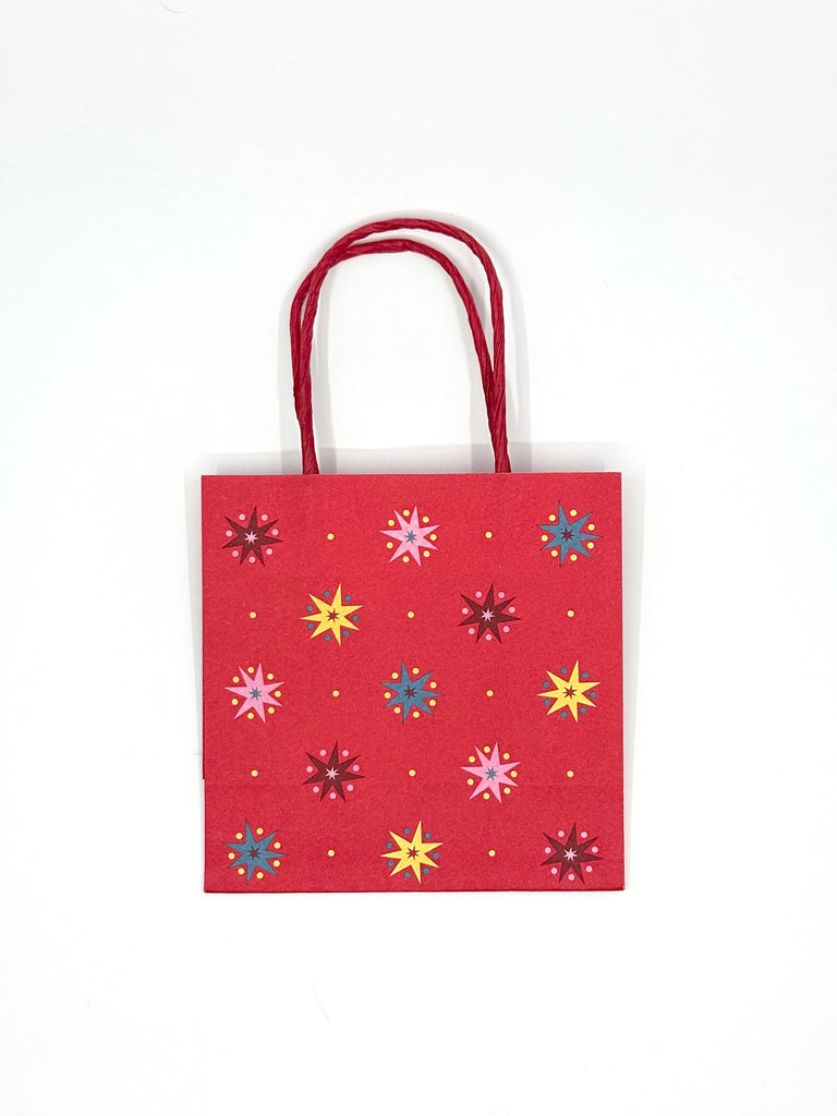 - Holiday Gift Bags measure: 4”x4”x2” (10x10x5cm) with handles reaching 2.5” (6.5cm).