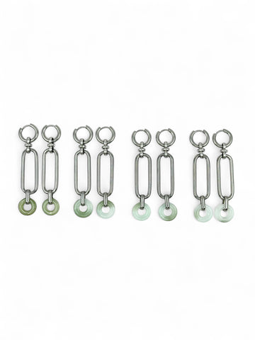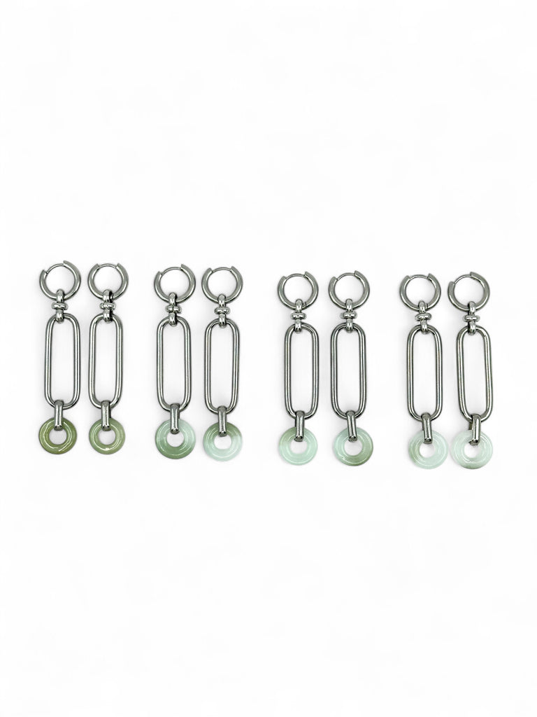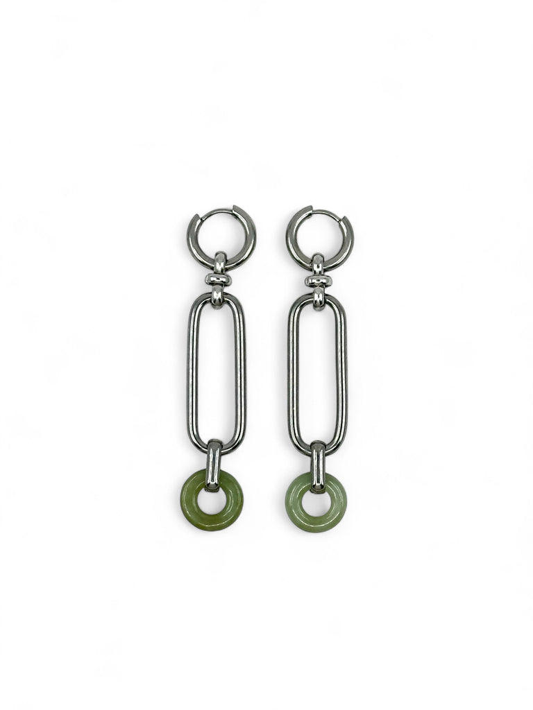 The Jade Ios Earrings in the large format are a modern earring with clean lines and delicate Jade disks.