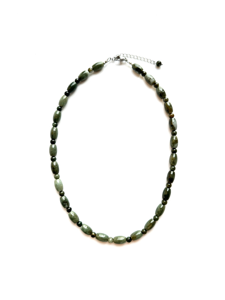 The Jin Jade Necklace is a modern take on a heavier traditional Jade necklace. It’s a unisex piece but it has been a popular request with our male customers at our in-person markets. Jade photographs darker and in sunlight it just glows. Most of the Jade is dark green but there are some minimal hints white Jade hidden in the beads.