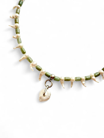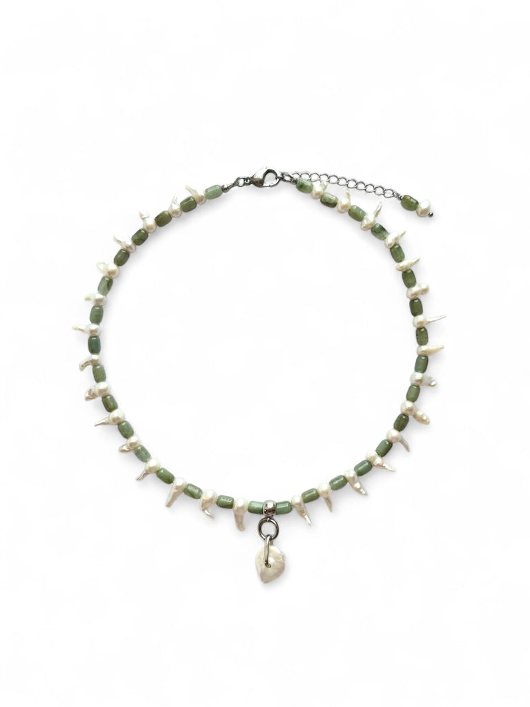 A one-of-kind piece. Inspired by Ghibli animated film, Princess Mononoke, this piece combines Jade with Freshwater Pearls in a unique way. It’s edgy and evocative but somehow still very organic in nature.