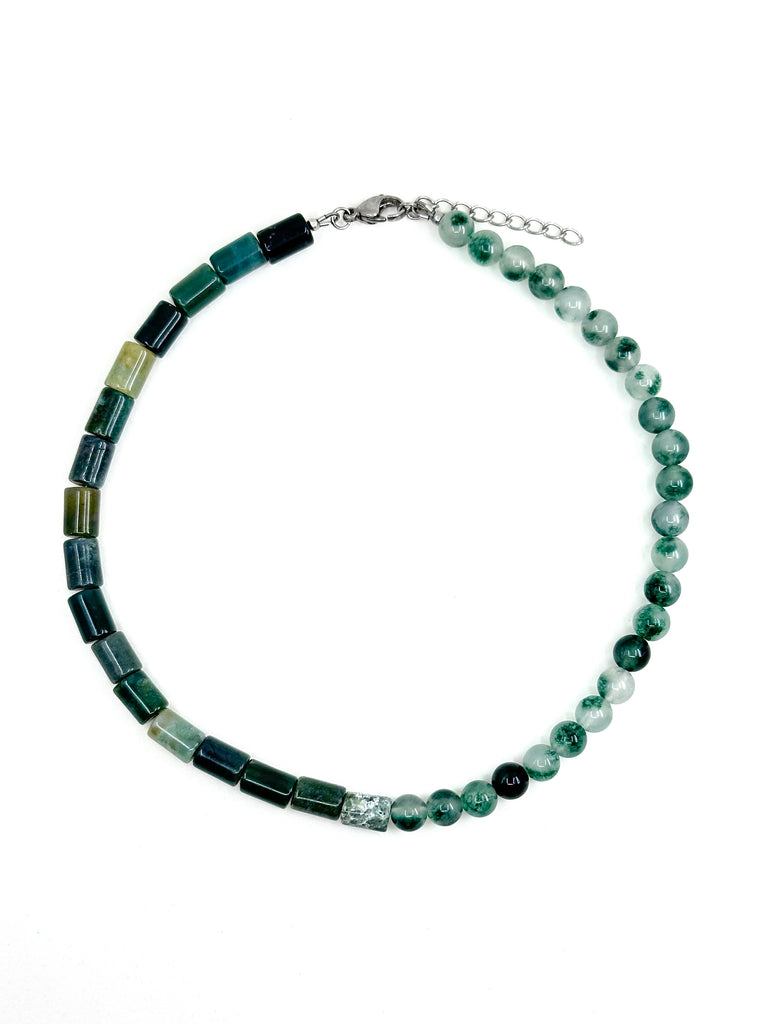 - Combines tube-shaped Moss Agate with round Moss Agate beads.