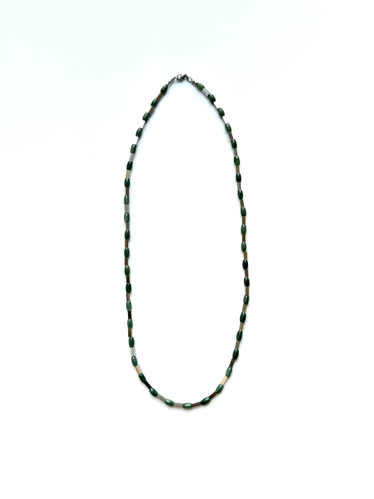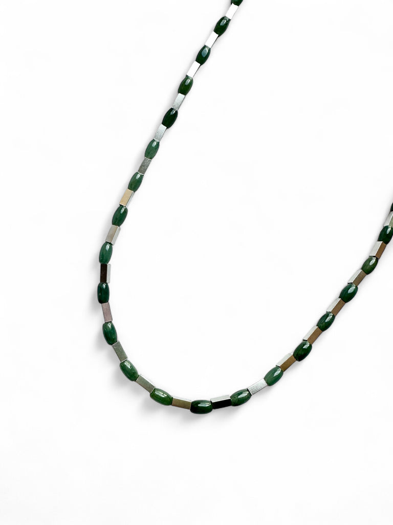 A really unique unisex piece. Made from different kinds of Jade beads and separated by rectangular glass stainless steel beads that give each Jade bead its own space to shine. This necklace sits longer at 25” (63.5cm) with a 2” (5cm) extension chain and is a great piece for layering.