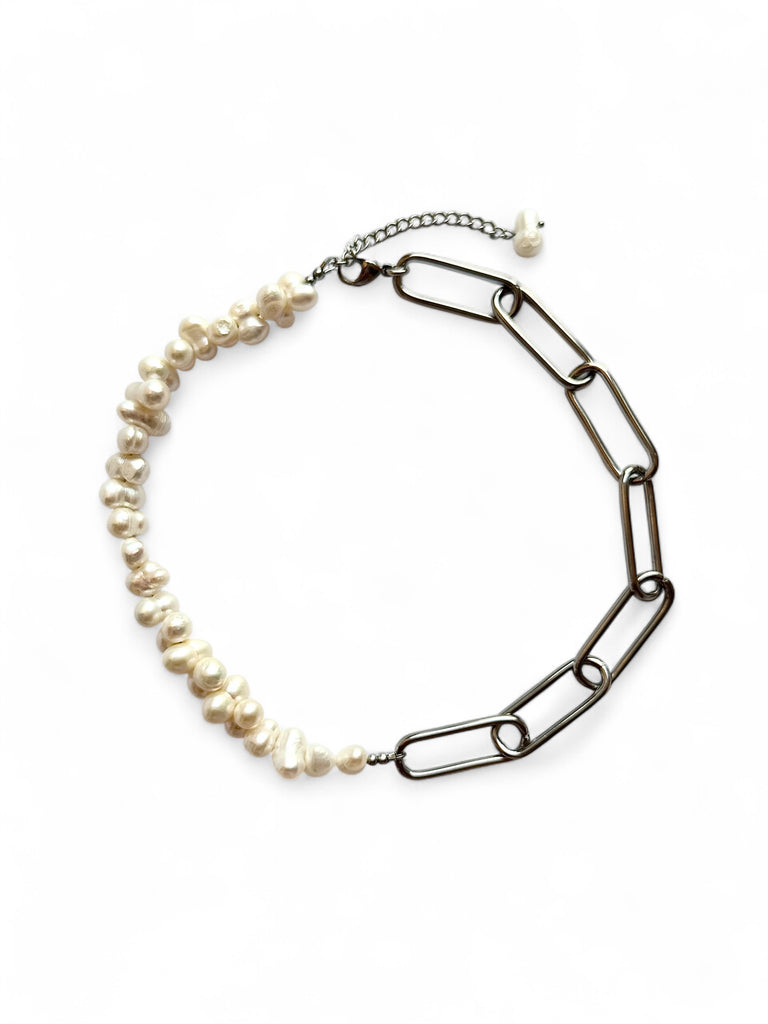 A really unique statement necklace that combines the softness of cream coloured Freshwater Pearls with the hardness of stainless steel chain (that was made and linked by hand by the designer).