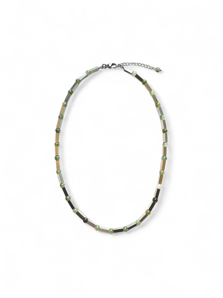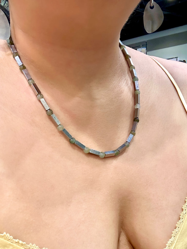 A really unique unisex piece. Made from different kinds of mostly green Jade beads and separated by rectangular glass stainless steel beads that give each Jade bead its own space to shine. This necklace comes in 2 lengths and sits longer. Model wears the longer length at 20.5” (52cm) in last picture.